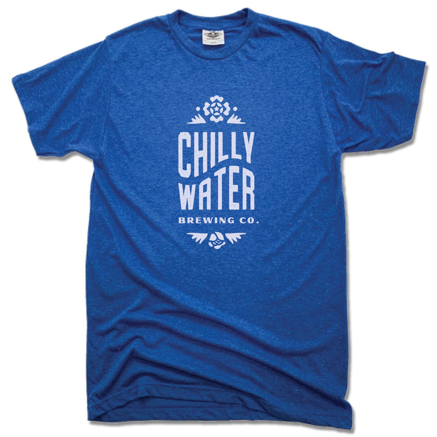CHILLY WATER BREWING | UNISEX BLUE TEE | CWB VERTICALSPOT WHITE LOGO